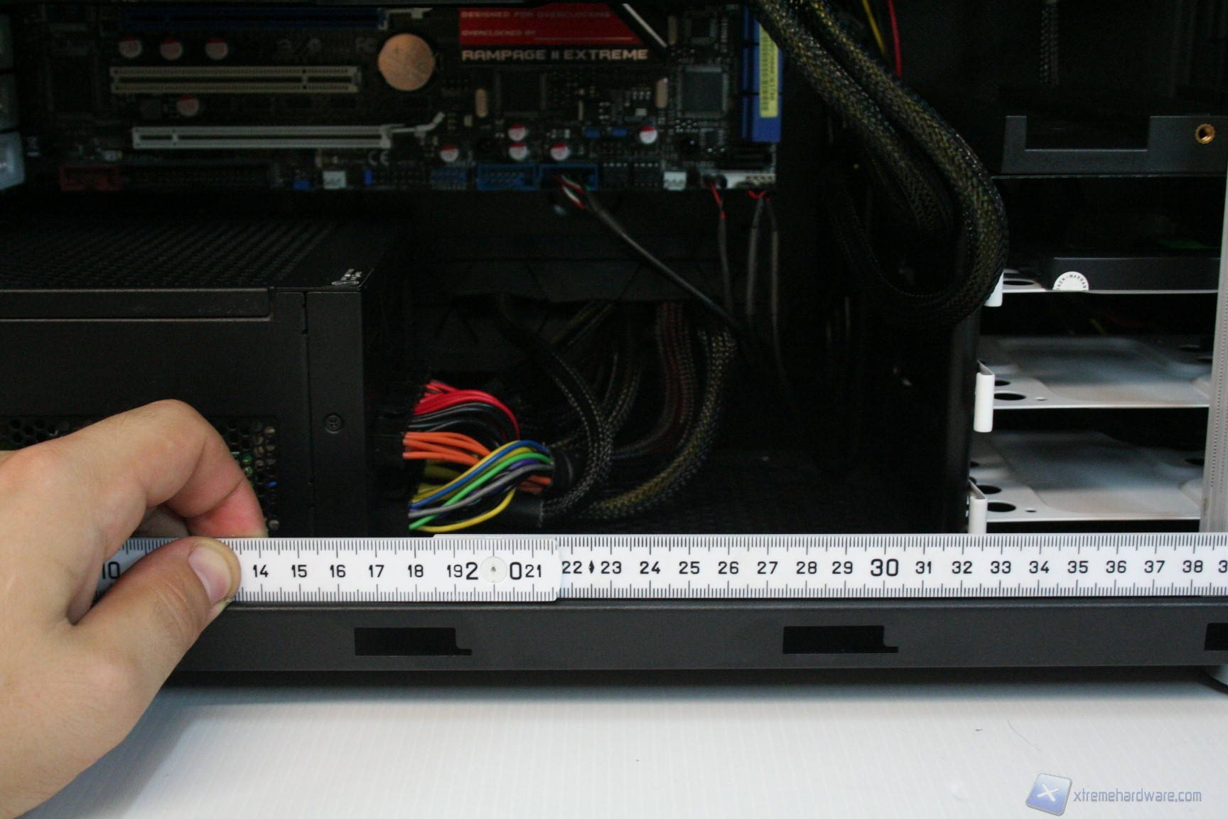 Particolare menzione va al sistema di controllo delle ventole fornito in bundle, che secondo quanto riportato nel manuale andrebbe montato nell'apposito slot PCI laterale. Consigliamo invece di montarlo nel primo slot PCI vicino alla ventola da 140mm posteriore perché così facendo questa è l'unica soluzione che permette di nascondere i cavi dietro all'apertura della scheda madre. Purtroppo nella configurazione consigliata i cavi sono troppo corti, e fondamentalmente sarebbe anche antiestetica. Terminata l’operazione vi consigliamo di connettere tutte le ventole del cabinet, che potrete cablare direttamente dietro alla paratia di installazione della scheda madre vicino all'apertura posteriore della CPU. Fatto questo bisogna connettere le ventole del dissipatore, fare un check dei cavi Sata, di alimentazione delle varie periferiche ed infine quelli sulla scheda madre. Ecco qui come si presenterà il case a lavoro terminato. Al fine della misurazione riportiamo il posizionamento del sensore di temperatura, posizionato direttamente sopra ai due cage degli hard disk.